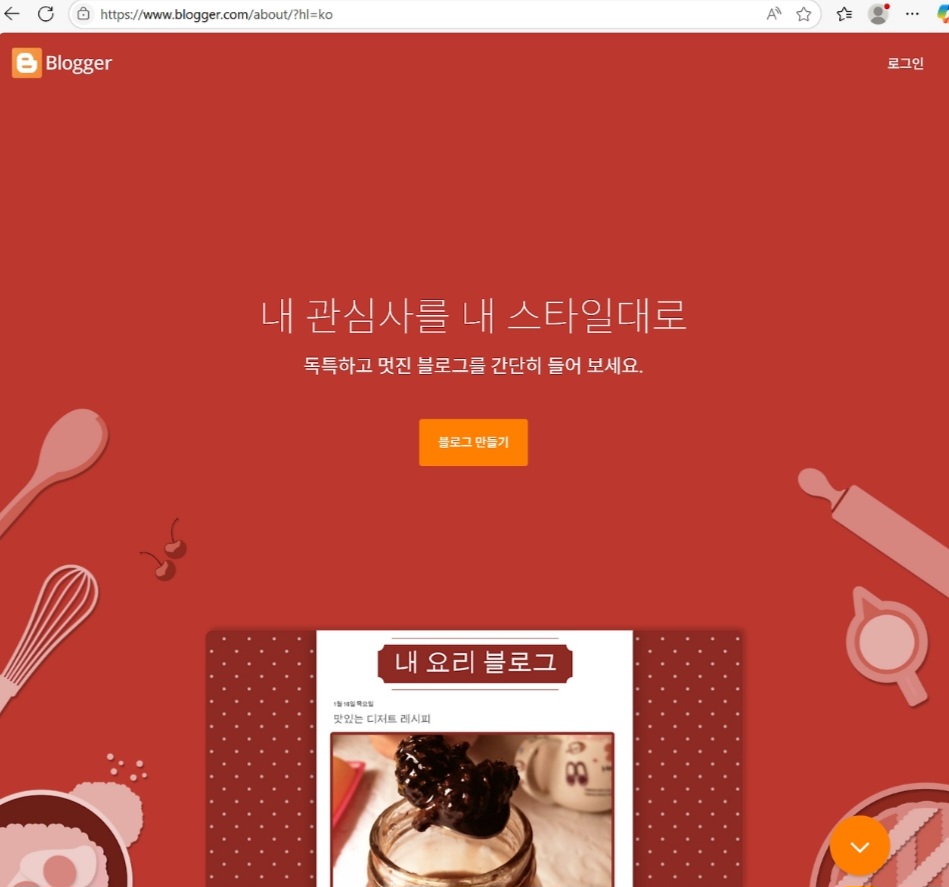 1. 구글 계정으로 로그인한 상태에서 주소창에 https://www.blogger.com을 입력한다.