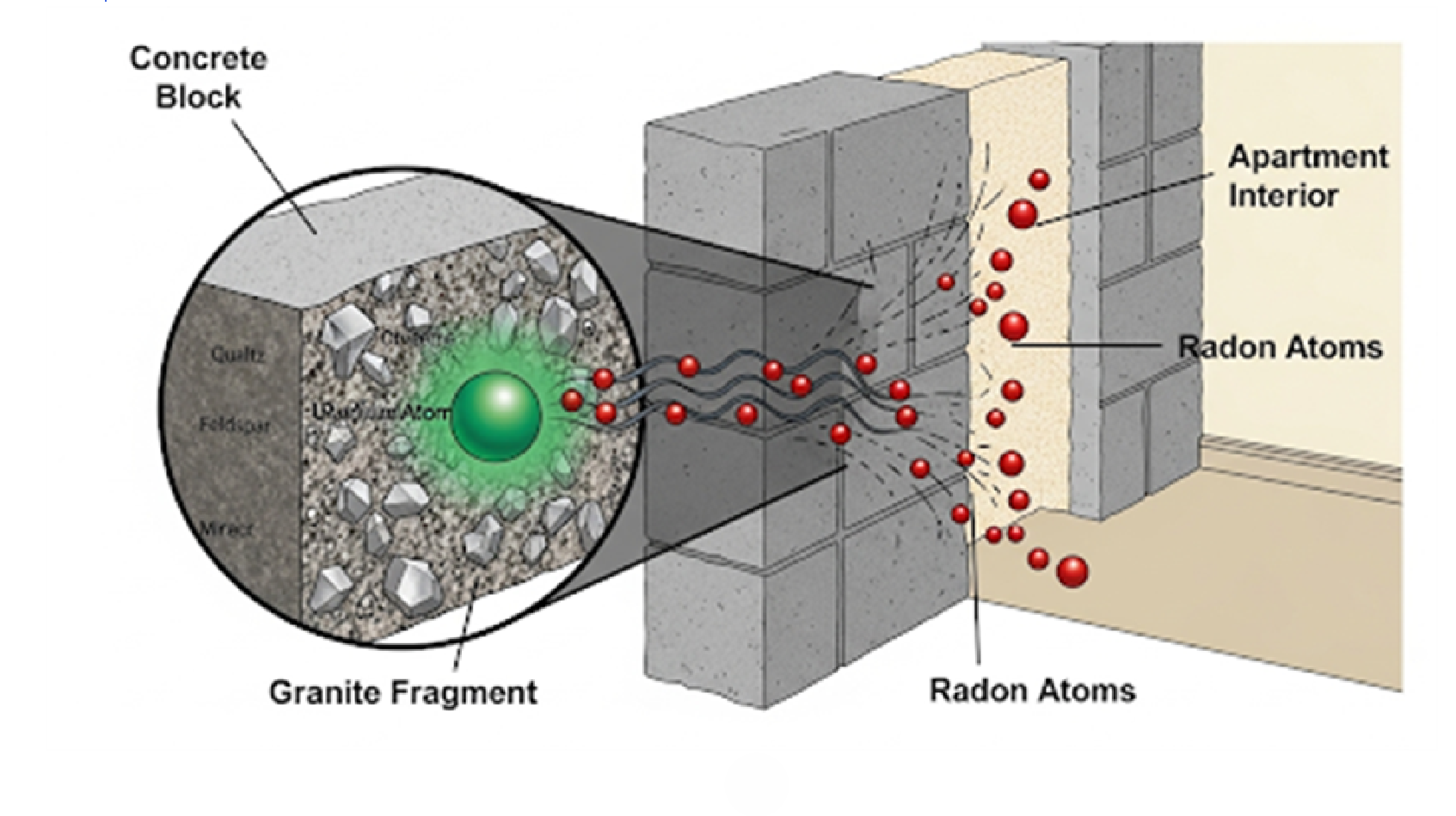 화강암이 포함된 콘크리트 벽에서 라돈이 발생하는 과정